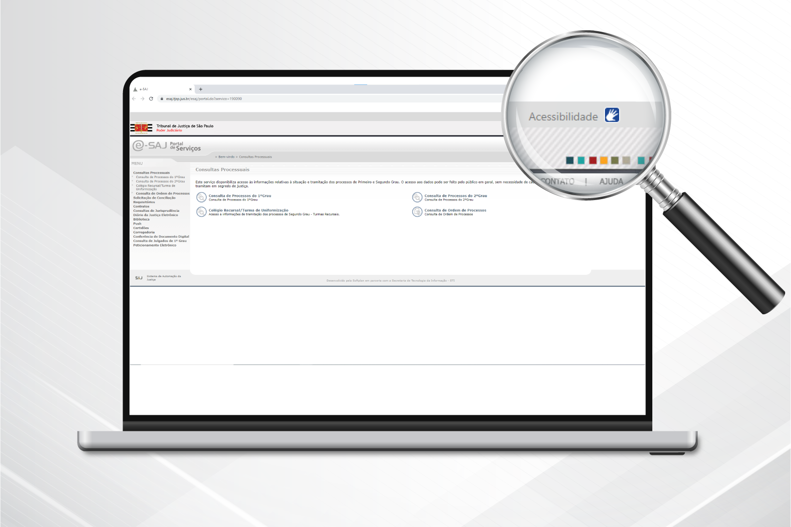 O Tribunal de Justiça de São Paulo disponibiliza aos usuários do portal e-SAJ uma barra de acessibilidade, que direciona para página com orientações sobre as ferramentas que podem ser utilizadas no sistema para auxiliar pessoas com deficiência. Basta clicar na palavra “Acessibilidade” ou no ícone do VLibras, localizados no canto direito do portal.